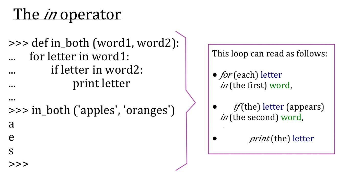The word in is a Boolean operator that takes two strings and returns True if the first appears as a substring in the second :